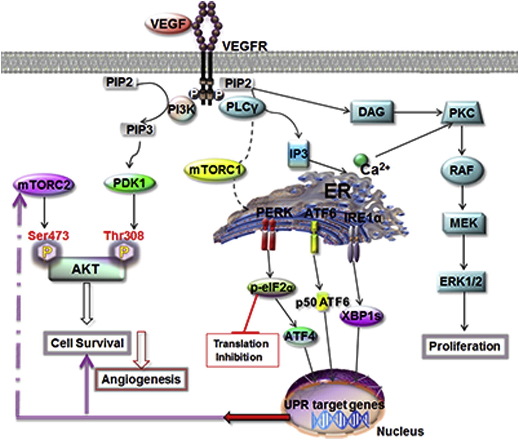 We have shown that VEGF activates the UPR mediators IRE1α, ATF6, and PERK in endothelial cells (ECs) through PLCγ signaling, a previously unknown function of this pathway. The effect is mediated via the mTORC1 complex, which connects VEGF signaling to UPR sensors located on the ER. This activation occurs independently of unfolded protein accumulation, indicating a physiological, non-stress UPR mechanism.